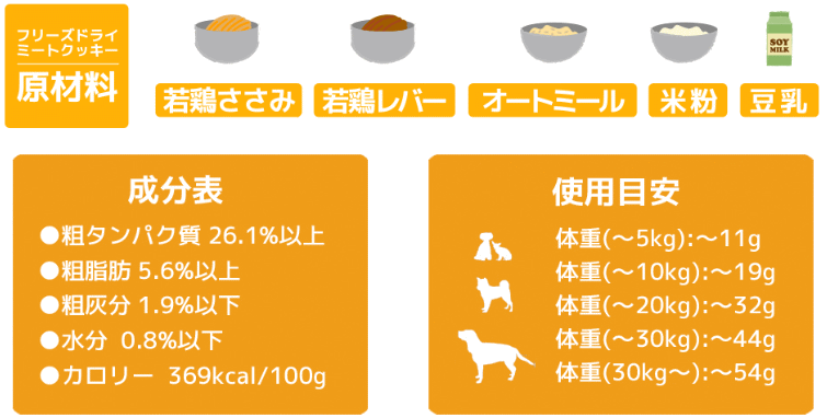 有機オートミール、国産米粉、豆乳を使用 小麦は使用せず、フリーズドライならではの旨味と香りをたっぷり閉じ込めたさっくり軽い食感 -------------------------------------- 【成分表】粗タンパク質26.1%以上 粗脂肪5.6%以上/ 粗灰分1.9%以下 水分0.8%以下 カロリー:369kcal/100g 国産 割れやすいため粉になったものはふりかけとしてご利用ください。