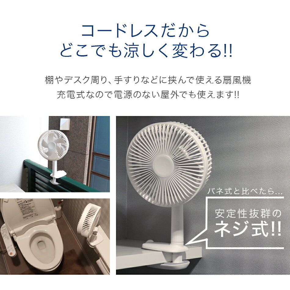 手動で前後180°、左右360°、自由に角度調節でき、 左右60°自動首振りモードを使えば、全方向へ送風ができます! オフィス、キッチン・トイレ・脱衣所など狭くて熱がこもりやすい空間で、 車内や電源のないアウトドアなどのシーンで大活躍します。