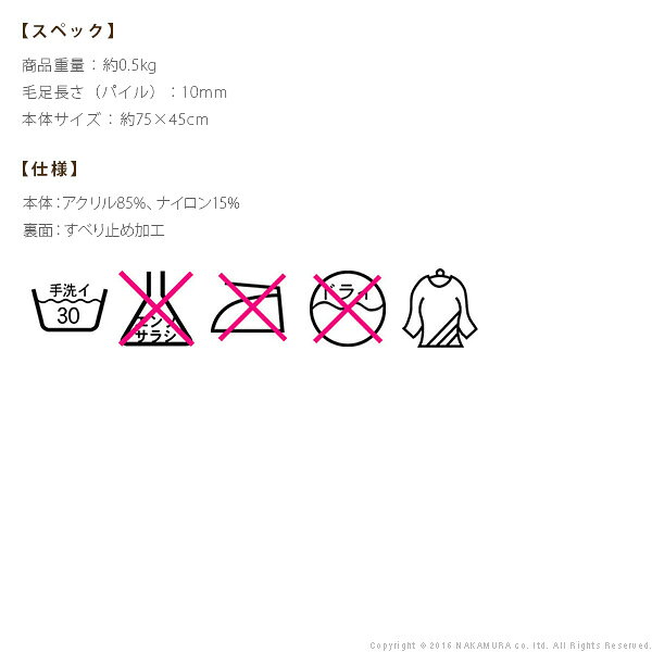 【カラーバリエーション】ピンク・グリーン【仕様】本体:アクリル85%、ナイロン15%裏面:滑り止め加工【サイズ】本体:約75x45cm重量:約0.5kg毛足長さ(パイル):約10mmお役立ちグッズ 玄関マット 室内 洗える 玄関マット 75x45cm 屋内 長方形 柄 おしゃれ エントランスマット マット ラグマット ウォッシャブル 滑り止め 防ダニ スミノエ 日本製 ピンク※入荷状況により、発送日が遅れる場合がございます。