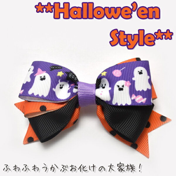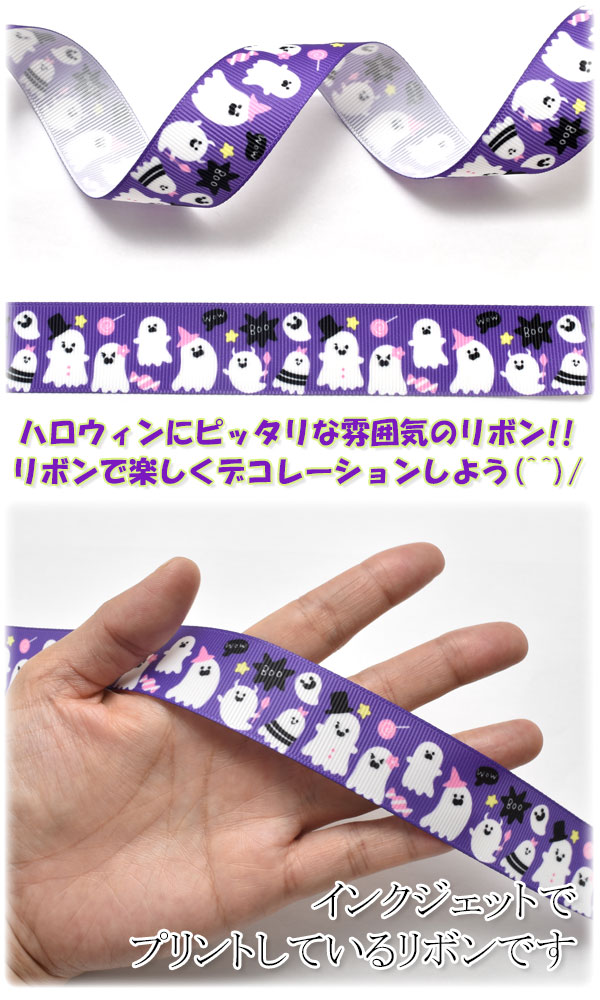 MD190912-75-23344Trick or Treat!! トリックオアトリート! お祭り気分になれるたのしげなハロウィンりぼんが登場です! 紫色をしたリボンに、真っ白のかわいいおばけが並んでいます。