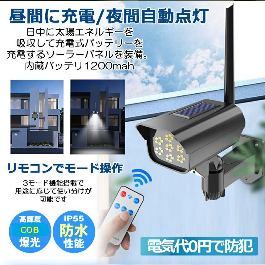 ダミーカメラ風センサーライト 防犯対策に 三つ点灯モード: (1)消灯+センサーモード、 (2)常光+センサーモード、 (3)常光モード(センサー無し) リモコンで切り替え可能です、自動的に電気のオンオフをしてくれるので「うっかり」を防ぐことができます。