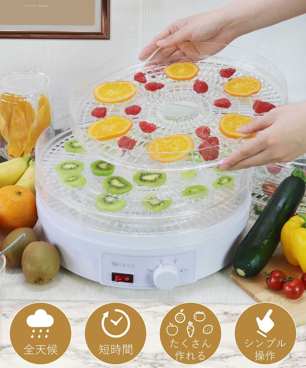 ■商品概要商品名 : フードドライヤーカラー :ホワイトサイズ: (約)32×33.5×27cm重量:(約)2.4kg電源:AC100Vコード長さ110cm周波数:50/60Hz消費電力:250W温度ヒューズ130℃材質:ABS樹脂、PBT樹脂、PS樹脂セット内容:本体、トレイ5枚、フタ、取り扱い説明書、保証書(本体:購入日より1年間 トレイ:購入日より3カ月)乾燥時間目安4〜8時間【免責事項】・ご使用前に取扱い説明書を必ずお読みいただき正しくお使いください。