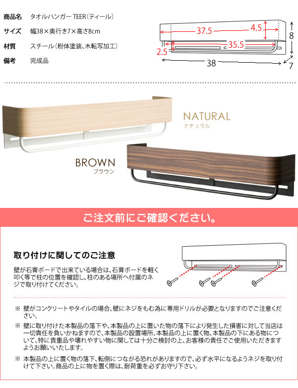 商品名タオルハンガー TEER(ティール) サイズ幅38×奥行き7×高さ8cm 材質スチール(粉体塗装、木転写加工) 備考完成品